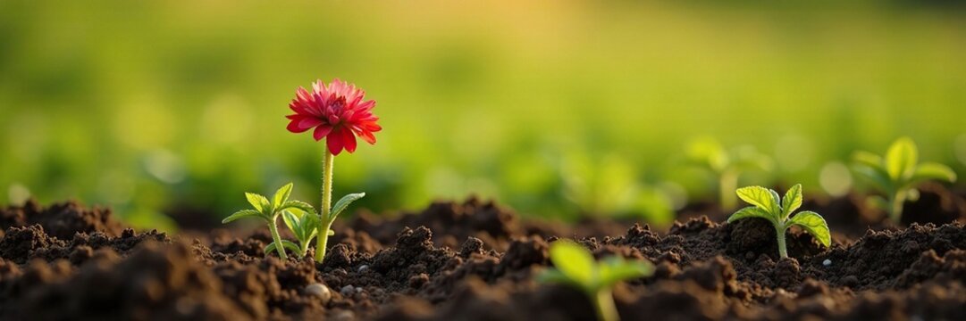 Field of Amaranthus cruentus with a few sprouts, wildflower, soil