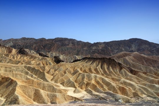 View of the lines, textures and shadows of the colorful badlands as seen from Zabriskie Point at Death Valley National Park
