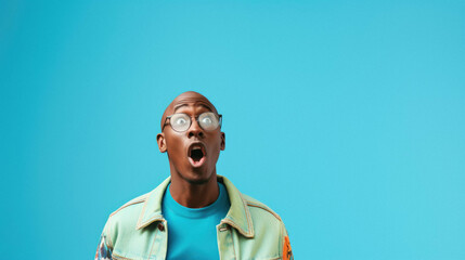 Portrait photo of excited surpeised guy open mouth open mouth wear casual stylish glasses isolated on blue color background.