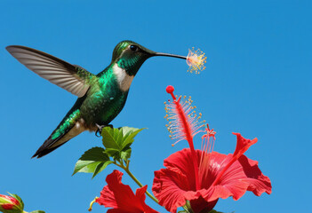 Sapphire-spangled Emerald hummingbird feeding on a hibiscus flower, blue sky background