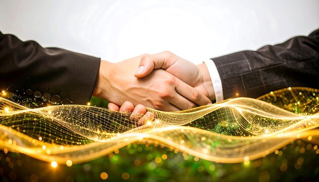Two businesspeople's hands shake, symbolizing a successful agreement, against a backdrop of a golden digital landscape.