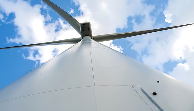 Close-up view of a wind turbine's structure against a partly cloudy sky.