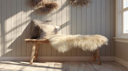 Winter morning corner with pale wood bench, sheepskin throw, and soft daylight filtering in