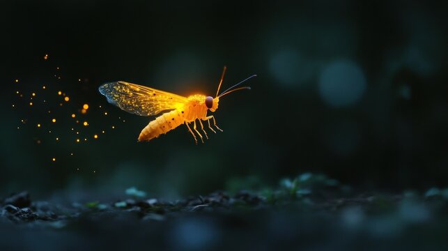 Glowing insect flying at night, dark forest background, nature photography, website banner