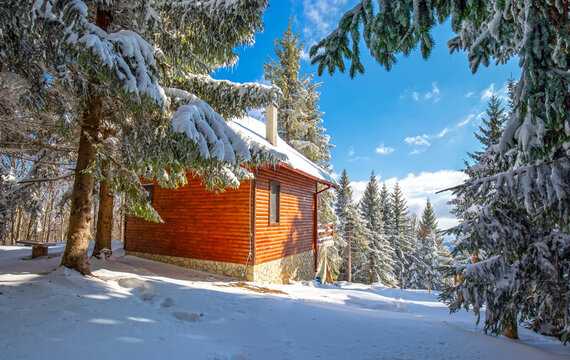 Wooden shed in snowy mountain landscape
