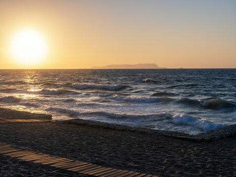 Woman hands holding mobile phone at sunset. Young curly hair woman taking photos with her cell phone in a beautiful amazing sunset over sea. Taking a picture on a smartphone during a vacation