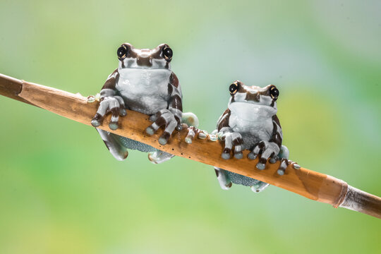 The Amazon milk frog (Trachycephalus resinifictrix) closeup on branch, Panda bear tree frog on branch. The mission golden eyed tree frog
