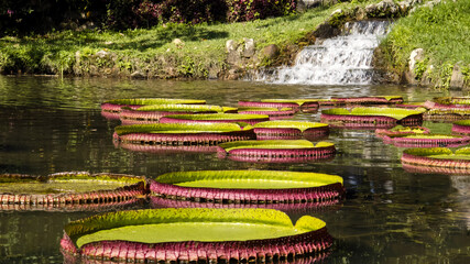 Victoria Regia, waterfall. Water lilies in a small stream in the botanical garden, Rio de Janeiro. Botany: angiosperm of the Nymphaeaceae family, exclusively aquatic.Rio de Janeiro, Brazil