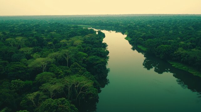 Amazon rainforest aerial view background. River cutting through dense, lush tropical forest. Calm water reflects greenery of surrounding trees and creating serene and peaceful atmosphere