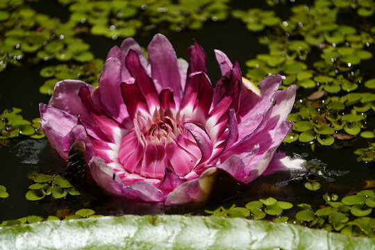 Huge white flower of Giant Waterlily (Victoria amazonica) blossoming in pond, Adelaide, South Australia
