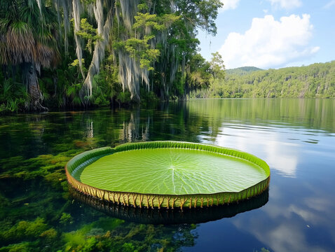 Amazonian big water lily leaf, reflection in water. Leaf of Victoria Regia, largest water lily in the world, Amazon, panoramic view. Victoria amazonica or cruziana
