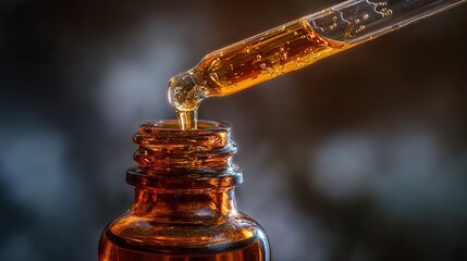 Experience pure luxury as golden serum drips from dropper into amber bottle for ultimate skincare.