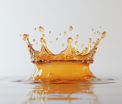Macro amber liquid ripple forming droplet crown with glossy reflections and warm highlights