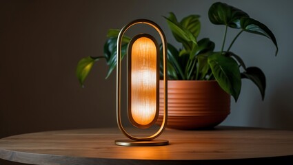 Modern oval shaped table lamp with warm glowing light and green potted plant in background