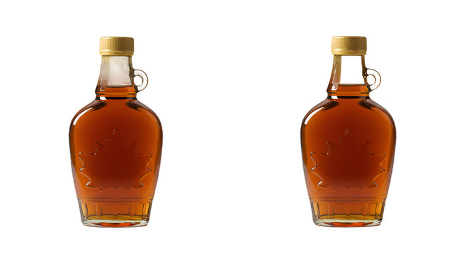 Two Amber Maple Syrup Bottles with Golden Caps and Embossed Maple Leaves