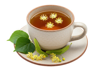 Rustic speckled ceramic cup with warm amber linden tea and yellow blossoms, a linden sprig beside, on a transparent background with copy space, close-up still life product photography. Concept of