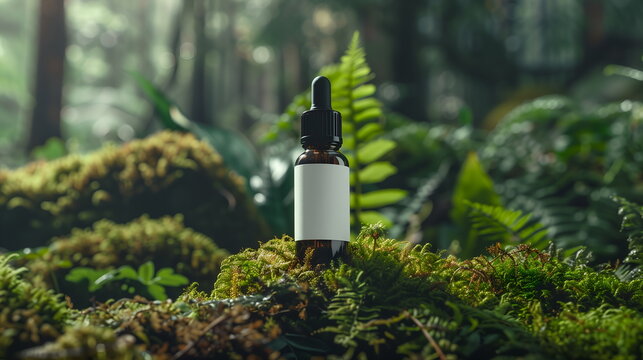 Luxurious natural skincare product dropper bottle with extract in forest setting - mockup 2oz glass tincture bottle in a beautiful setting lush green herbal