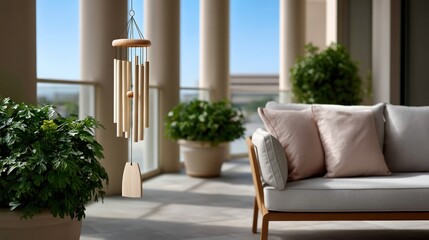Outdoor patio with wind chime and seating