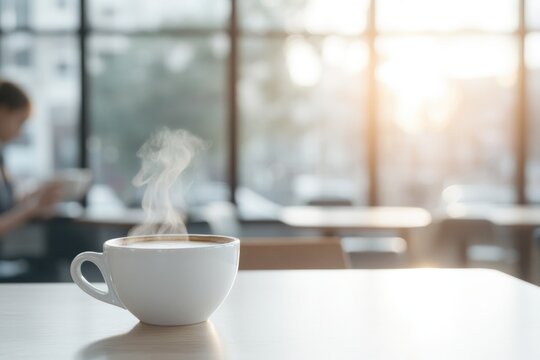 Tranquil urban morning with coffee and city skyline background