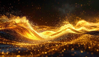 Abstract glowing golden waves of shimmering particles in dark ambient space with bokeh and subtle light flares creating a magical and luxurious atmosphere