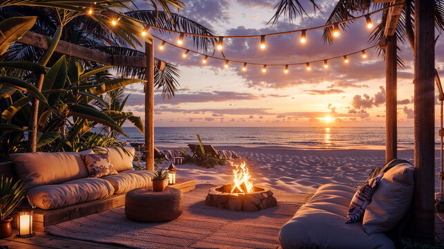 Coastal sitting area bathing in warm amber light with sunset ocean view through window