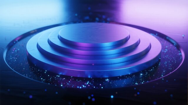 A futuristic circular platform with glowing blue and purple hues, surrounded by sparkling particles on a dark reflective surface.