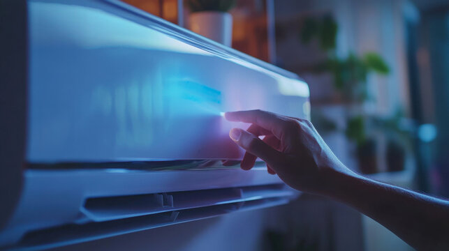 Adjusting air conditioner with soft ambient lighting, hand pressing button on modern cooling unit, home comfort, energy-efficient control, indoor temperature setting, cozy evening