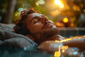 This image portrays a woman's relaxing moment in water with a backdrop of warm, glowing lights for an intimate feel
