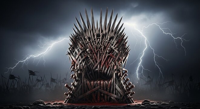 The Epic Iron Throne of Westeros a symbol of ultimate power and a brutal testament to the cost of ambition amid a stormy and war-torn landscape