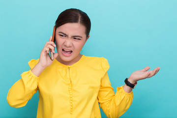 Woman calling the smartphone and she feel angry