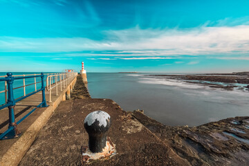Lighthouse and splashing waves; Amble, Northumberland, England