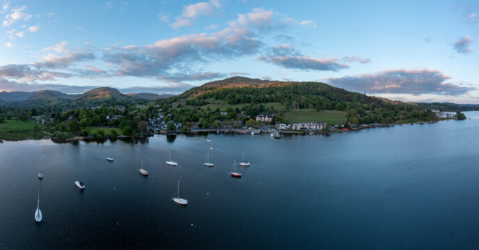 The vast expanse of Lake Windermere shown from above the village of Ambleside in the British Lake District.