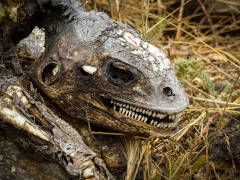 A close up of a dead and rotting corpse of land iguana.