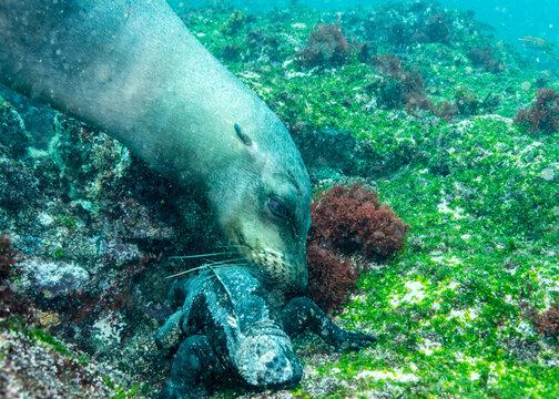 Galapagos marine iguana (Amblyrhynchus cristatus) forages algae from the sea bed, the only diving lizard. Playful sealions like to harash marine iguanas, often with tragic results of drowning.