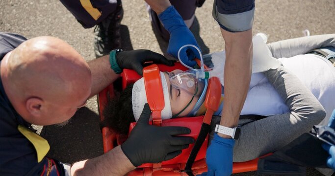 Paramedic, emergency and injury on road from car crash accident with healthcare, EMT man and first aid. Patient, ambulance staff and medical help with rescue on stretcher for transport to clinic