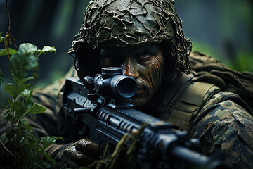 Camouflaged sniper in forest ambush  military marksman concealed in woods with rifle