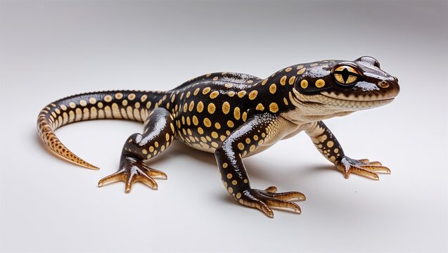 Full-body spotted salamander with legs spread and spotted skin shown, isolated on white