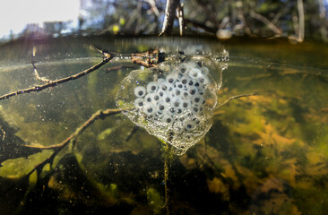 Spotted salamander egg sac attached to a submerged branch in a Massachusetts vernal pool.