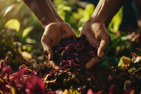 Hands gently holding rich dark soil amended with dark red compost, preparing for planting.