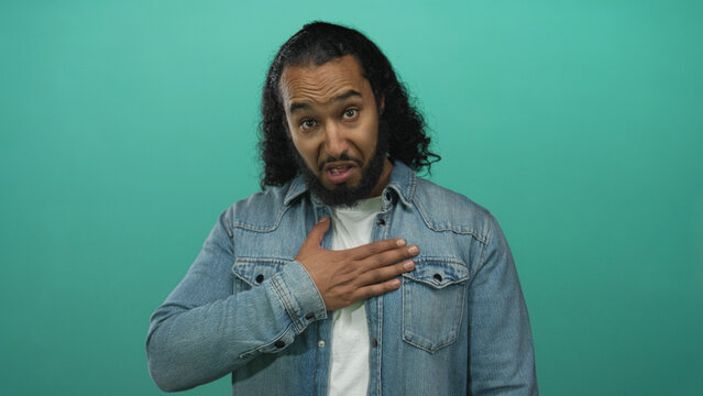 Man in denim jacket with hand on chest pointing to himself in teal studio, curly hair and beard visible; sincere apology.