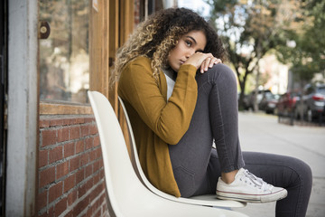Pensive Mixed Race woman sitting on chair in city