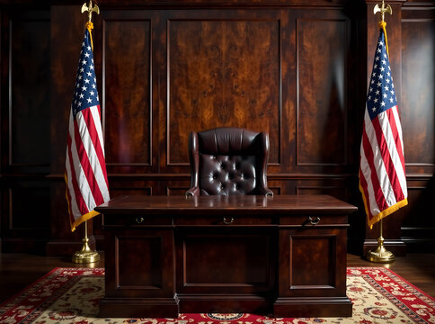 Formal dark-wood office setting featuring a stately table, high-back leather chair, and proud American flag standing tall behind, conveying authority and patriotism. new image