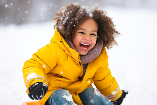 African american mixed race toddler with a yellow coat, laughing and having fun on a snow sled, sliding down hill of snow, winter snowy cold Christmas season