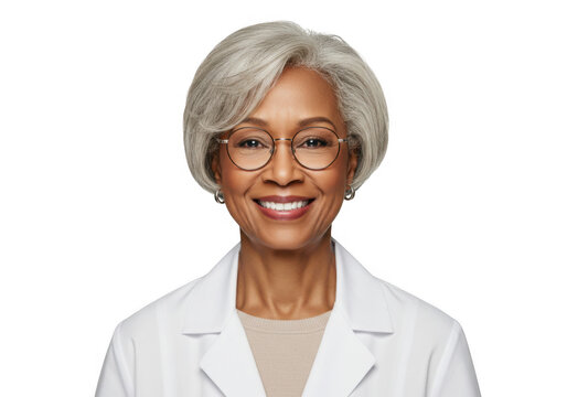 Smiling elderly woman doctor wearing glasses isolated on transparent background
