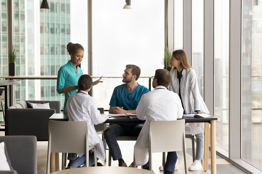 young african american doctor raising hand near multiethnic colleagues during medical seminar