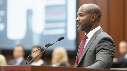 Side view portrait of African American man in blue scrubs engaged in colleagues presentation at doctors conference in meeting room while taking continuing learning course at hospital, copy space