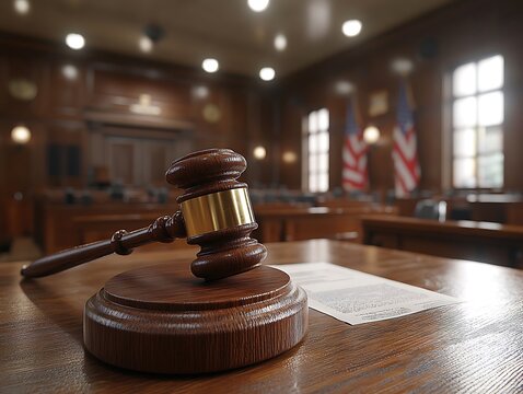 City Council Meeting Chamber With Central Podium and Semi Circular Desks for Members Displaying Flags in Blurred Background