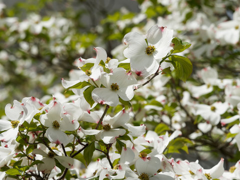 Close-up of white dogwood blooms with blurred background