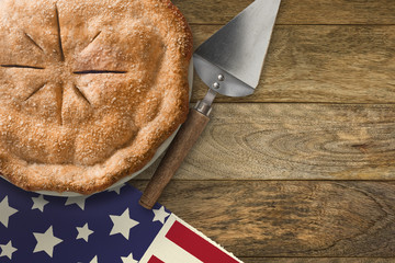 Pie and server on wood table with american flag table runner