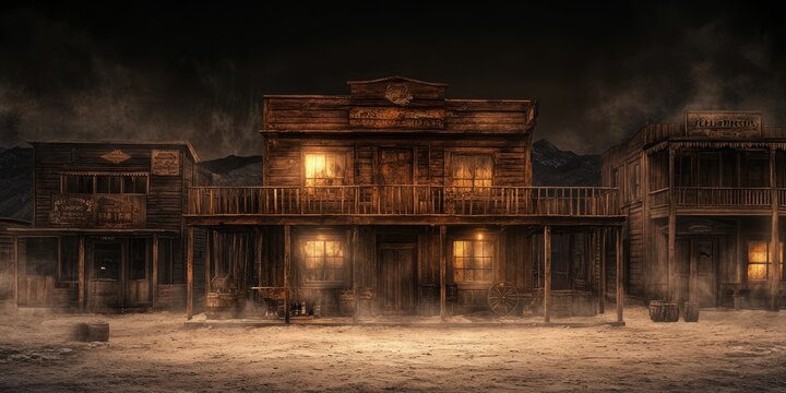 A dark, moody depiction of an old Western town with illuminated saloon windows and rugged terrain.